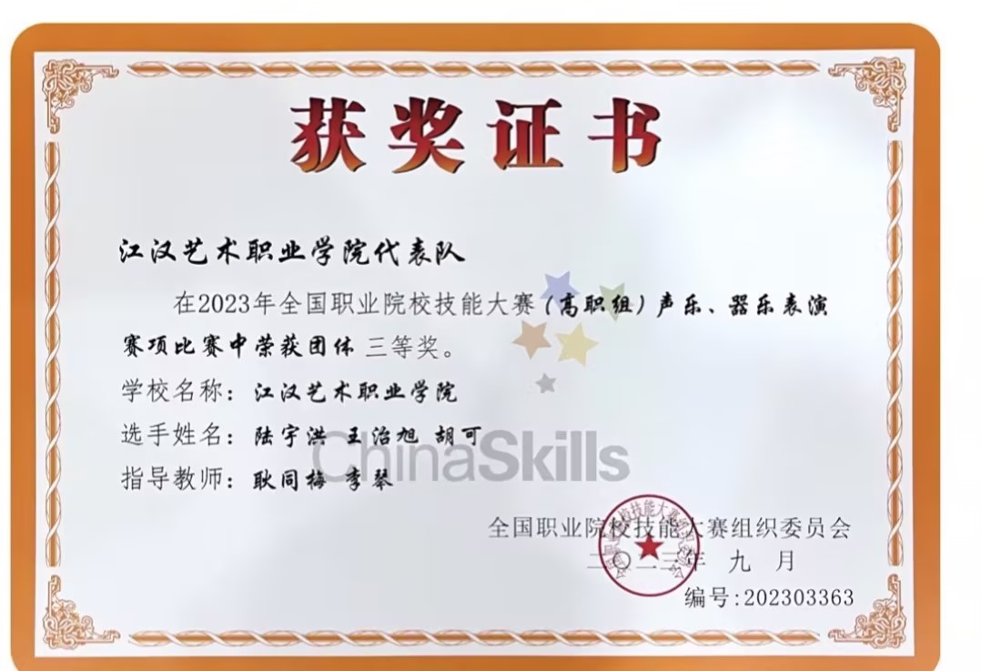 热烈祝贺beat365音乐学院陆宇洪、王治旭、胡可三位同学,在刚刚结束的2023全国首届职业院校技能大赛(高职组)声乐、器乐表演赛项中荣获三等奖。