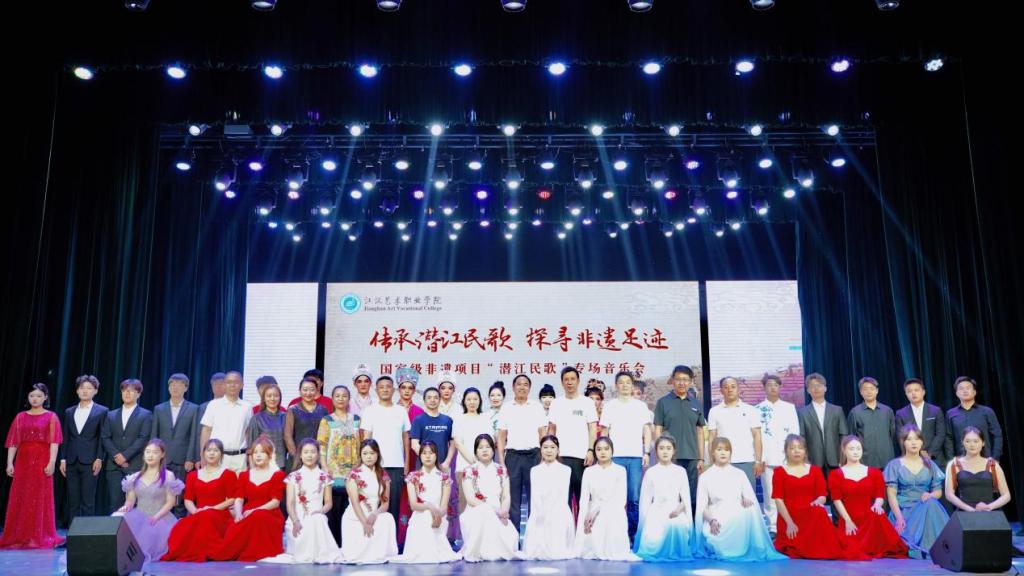 5月16日晚,“传承潜江民歌,探寻非遗足迹”国家级非遗项目“潜江民歌”专场音乐会在beat365在线体育官网登录入口风华楼剧场火爆上演。校党委副书记、校长程伦嵩,副校长廖江涛,党委委员周剑波,院务委员周红军,潜江市非物质文化遗产保护中心主任李彬、副主任施毅,beat365教务处处长李铁民,组织人事处处长练达,音乐学院党总支书记、院长耿同梅,中职部主任王祖艳出席活动,音乐学院全体师生共同观看演出。